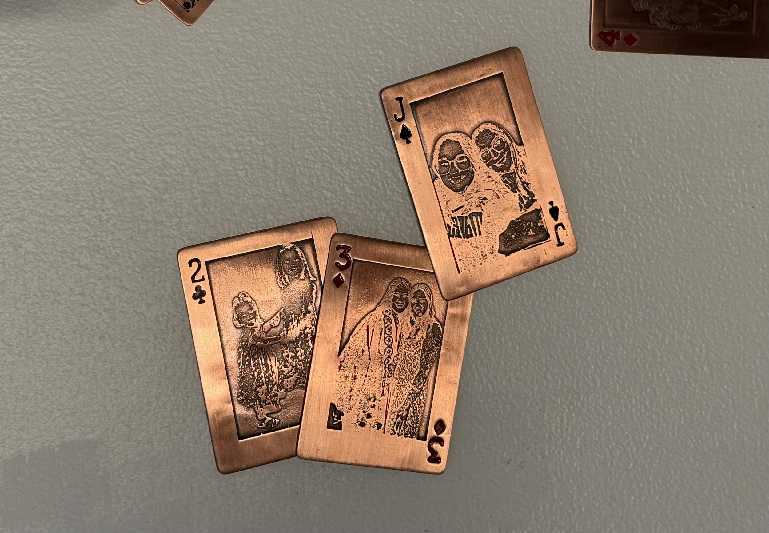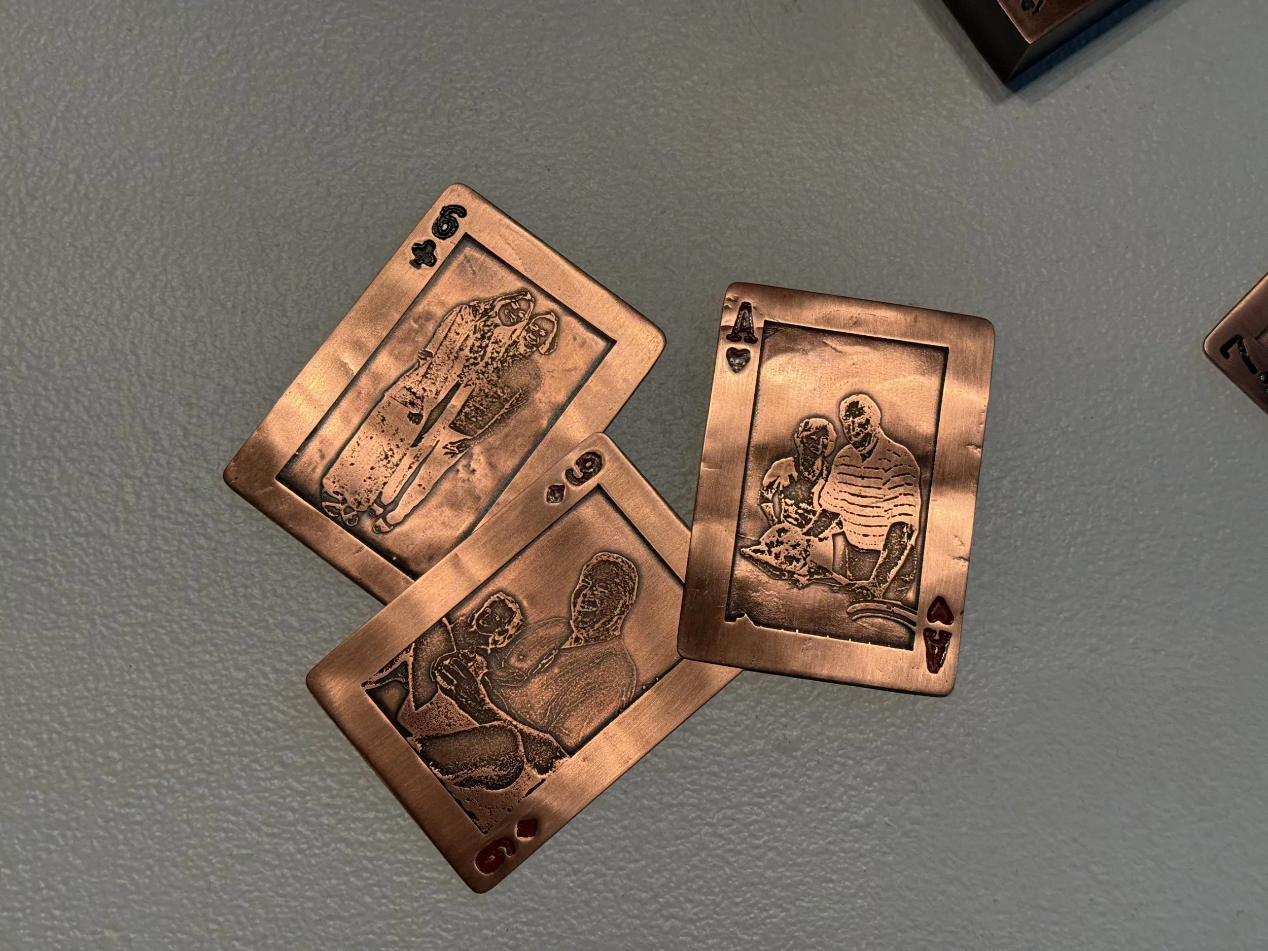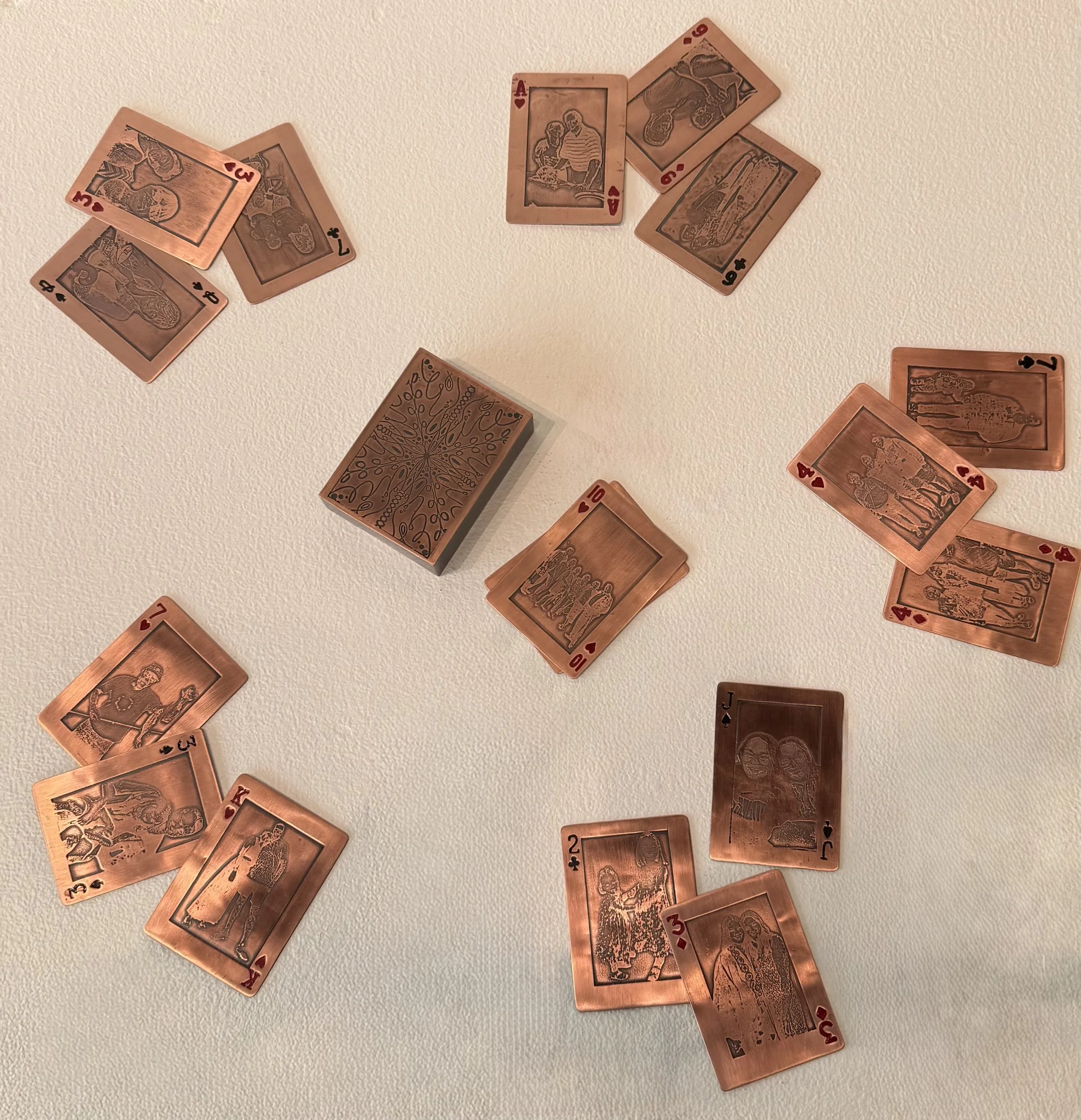 My work is intertwined with the memories, love, and shared experiences of my family. This series draws inspiration from a deck of cards and a game called Scat that has been a tradition throughout my life. Playing this game has created connections and laughter, bonding both sides of my family and continuously creating a sense of home. To make moments with my family more permanent, each card is etched with an image of someone special to me: my mom, dad, sister, and both sets of grandparents.