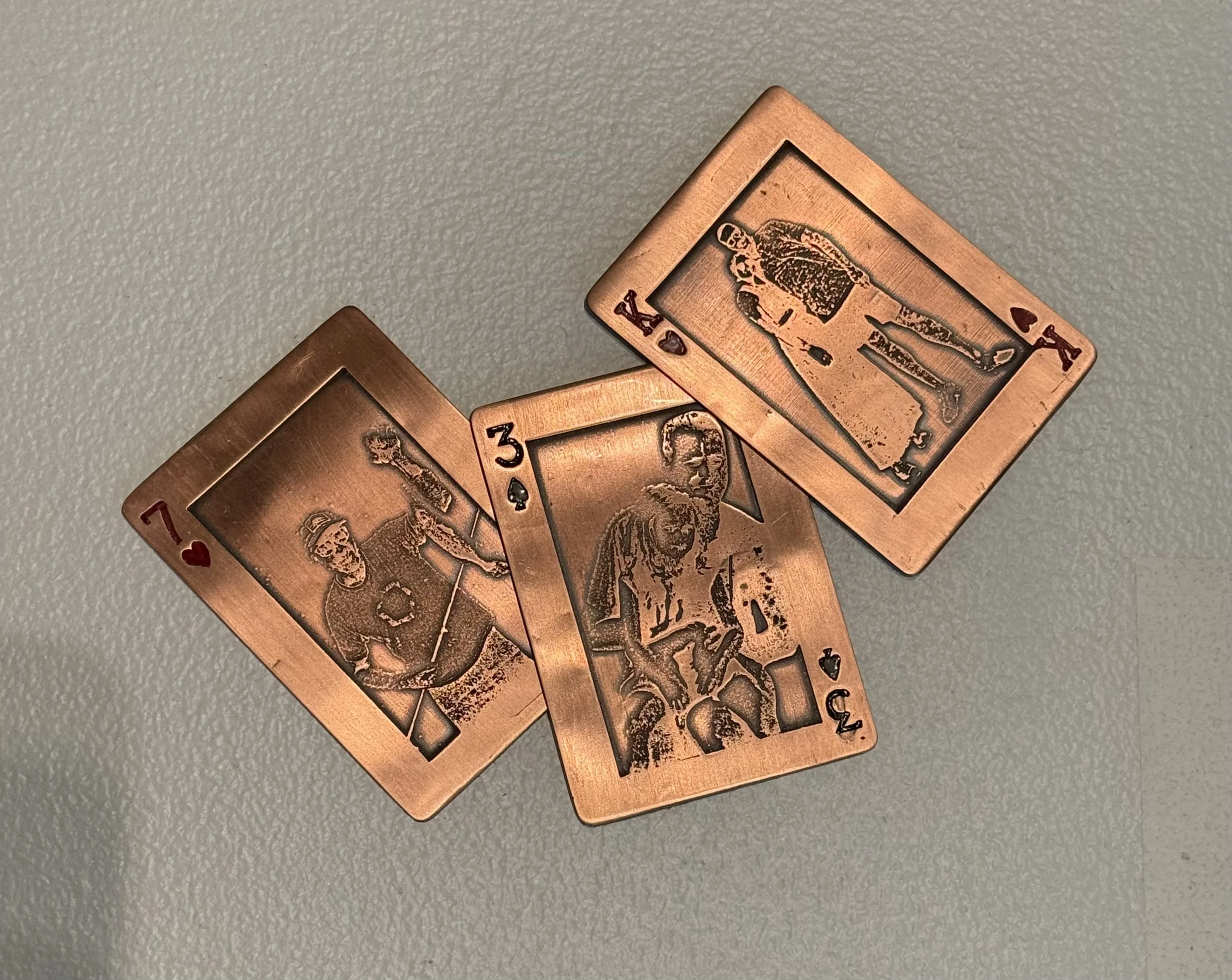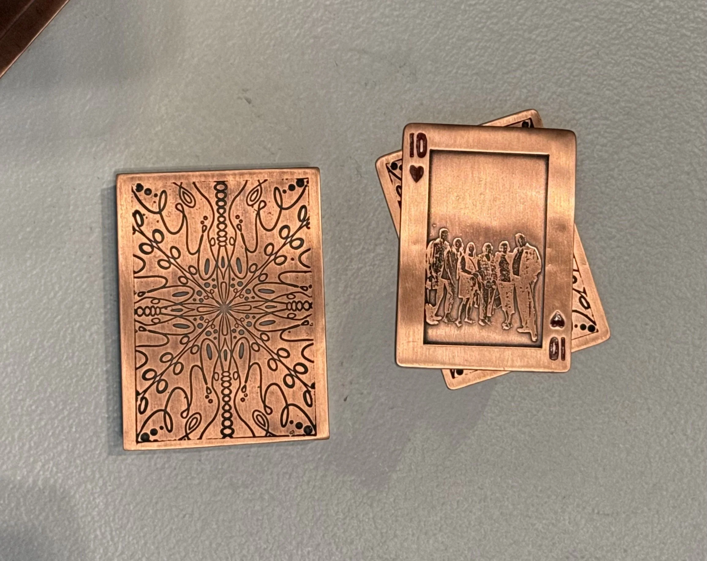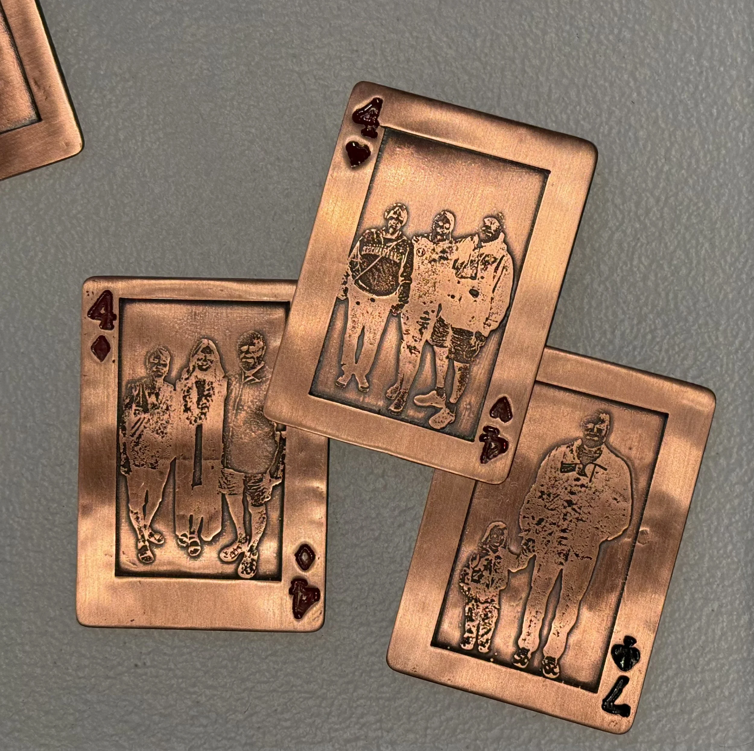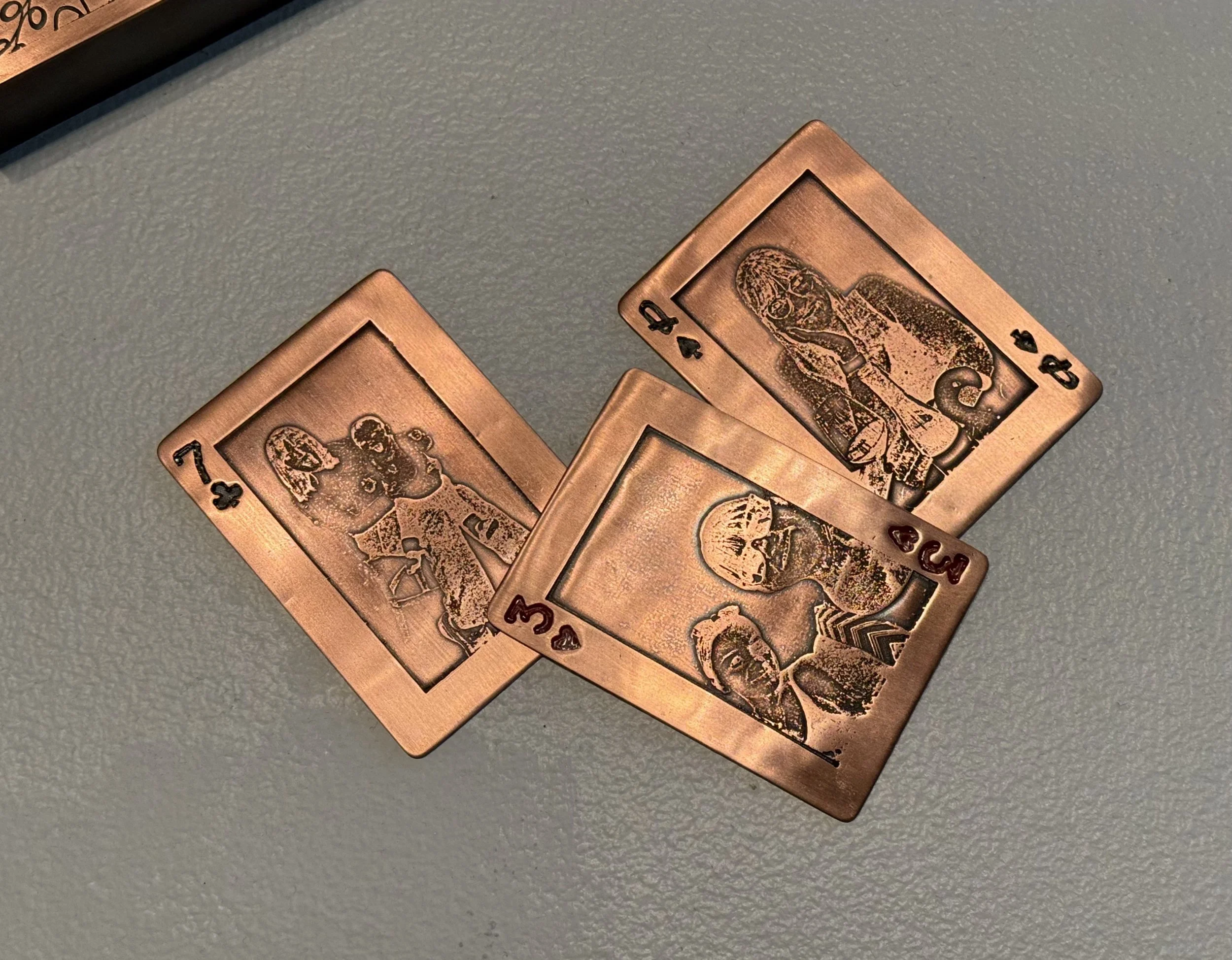 My work is intertwined with the memories, love, and shared experiences of my family. This series draws inspiration from a deck of cards and a game called Scat that has been a tradition throughout my life. Playing this game has created connections and laughter, bonding both sides of my family and continuously creating a sense of home. To make moments with my family more permanent, each card is etched with an image of someone special to me: my mom, dad, sister, and both sets of grandparents.
